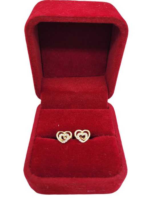 10K gold earrings. Double heart. CZ stone.