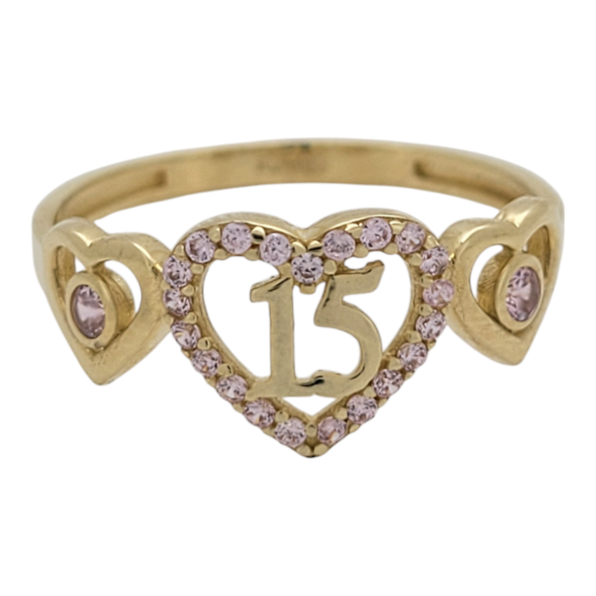 Expertly crafted with 10K gold, this Quinceañera ring features 3 hearts adorned with beautiful pink CZ stones. Perfect for celebrating a milestone birthday, this size 8 ring is sure to make a lasting impression. Upgrade any outfit with this elegant and timeless piece.