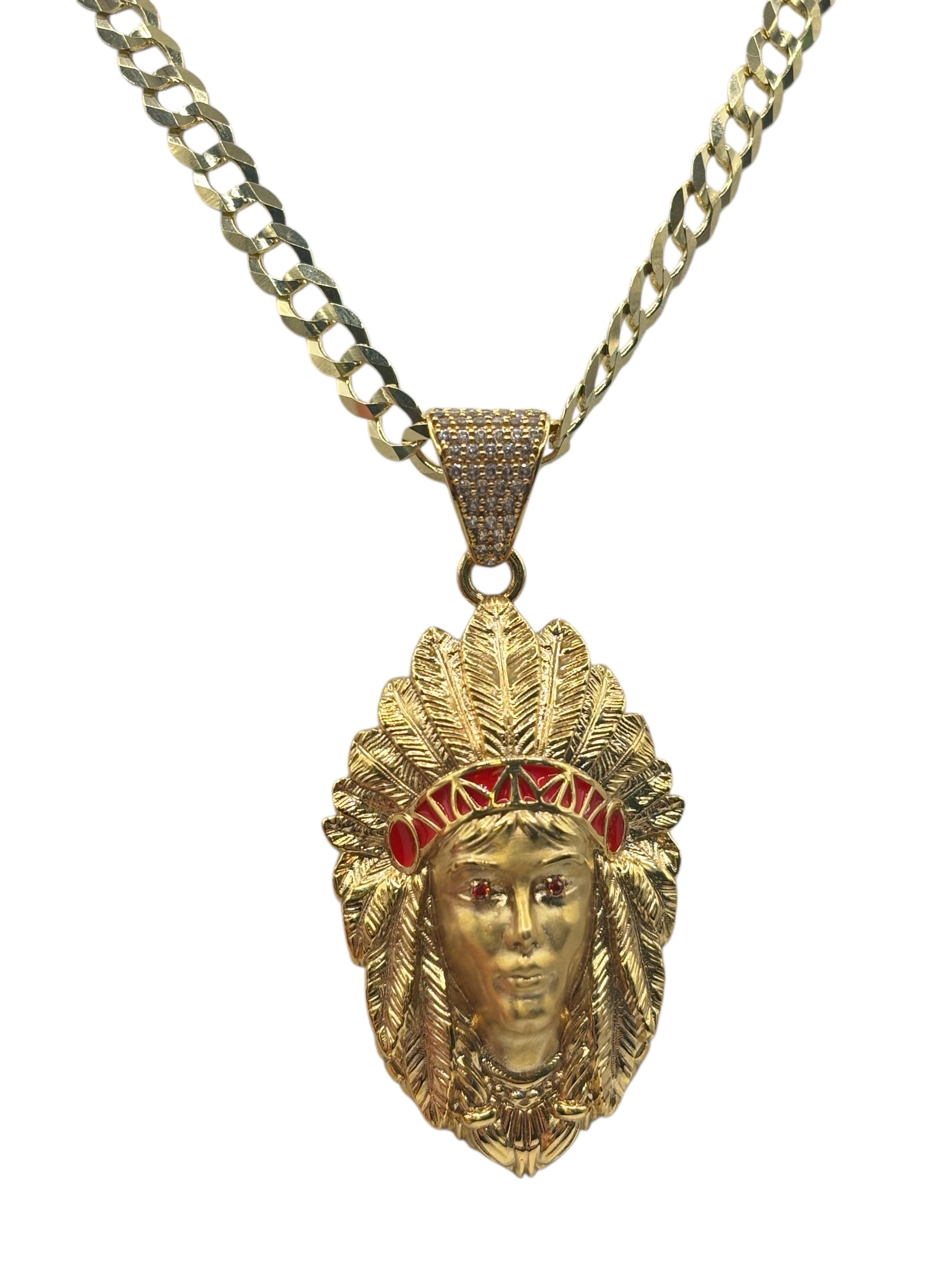 Decrease quantity for 10k gold Cuban chain with pendant of Indian with cz stones 26in 5.6mm