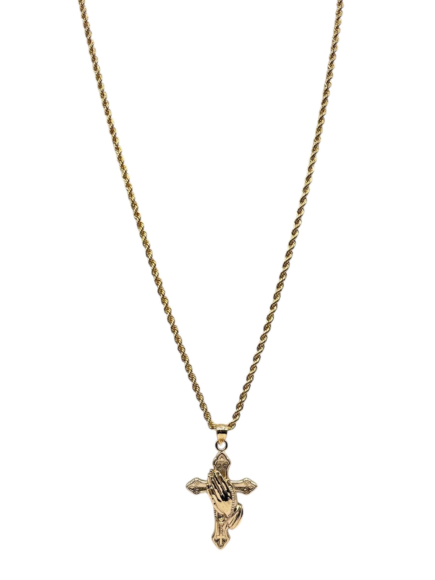 10k Gold Rope Chain with cross and hands of Jesus pendant 24in 2.8mm