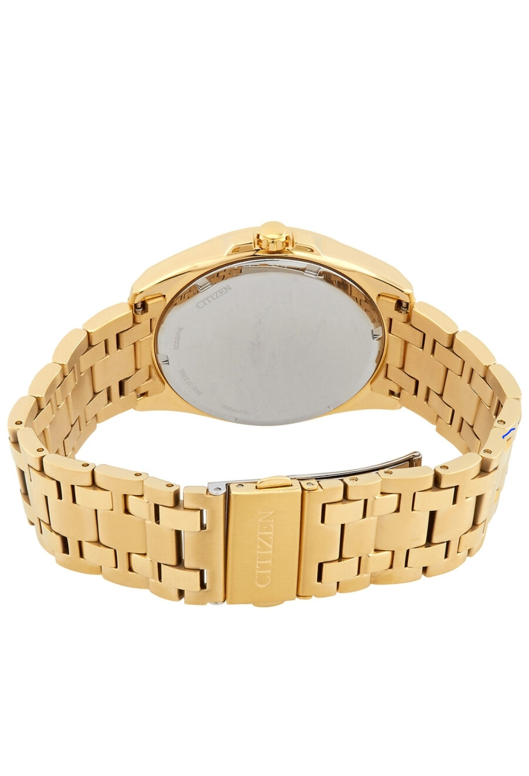 Gold-tone stainless steel case and bracelet. Fixed gold-tone stainless steel bezel. Blue dial with gold-tone hands and index hour markers. Arabic numeral minute markers (at 5 minute intervals). Dial Type: Analog. Luminescent hands and markers. Date display at the 3 o'clock position. Citizen Caliber Eco-Drive E111 eco-drive movement. Scratch resistant sapphire crystal. Pull / push crown. Solid case back. Round case shape, case size: 41 mm. Fold over clasp with a safety release. Water resistant at 100 meters / 330 feet. Functions: date, hour, minute, second, solar-powered. Peyten Series. Casual watch style. Watch label: Japan Movt. Citizen Peyten Eco-Drive Blue Dial Men's Watch BM7532-54L.