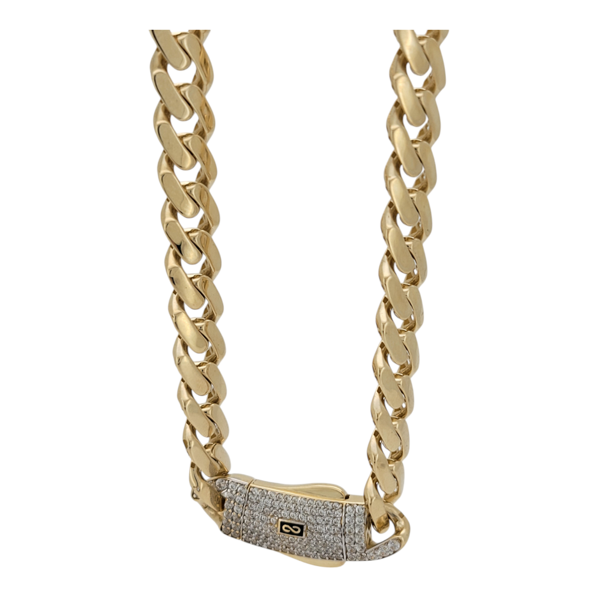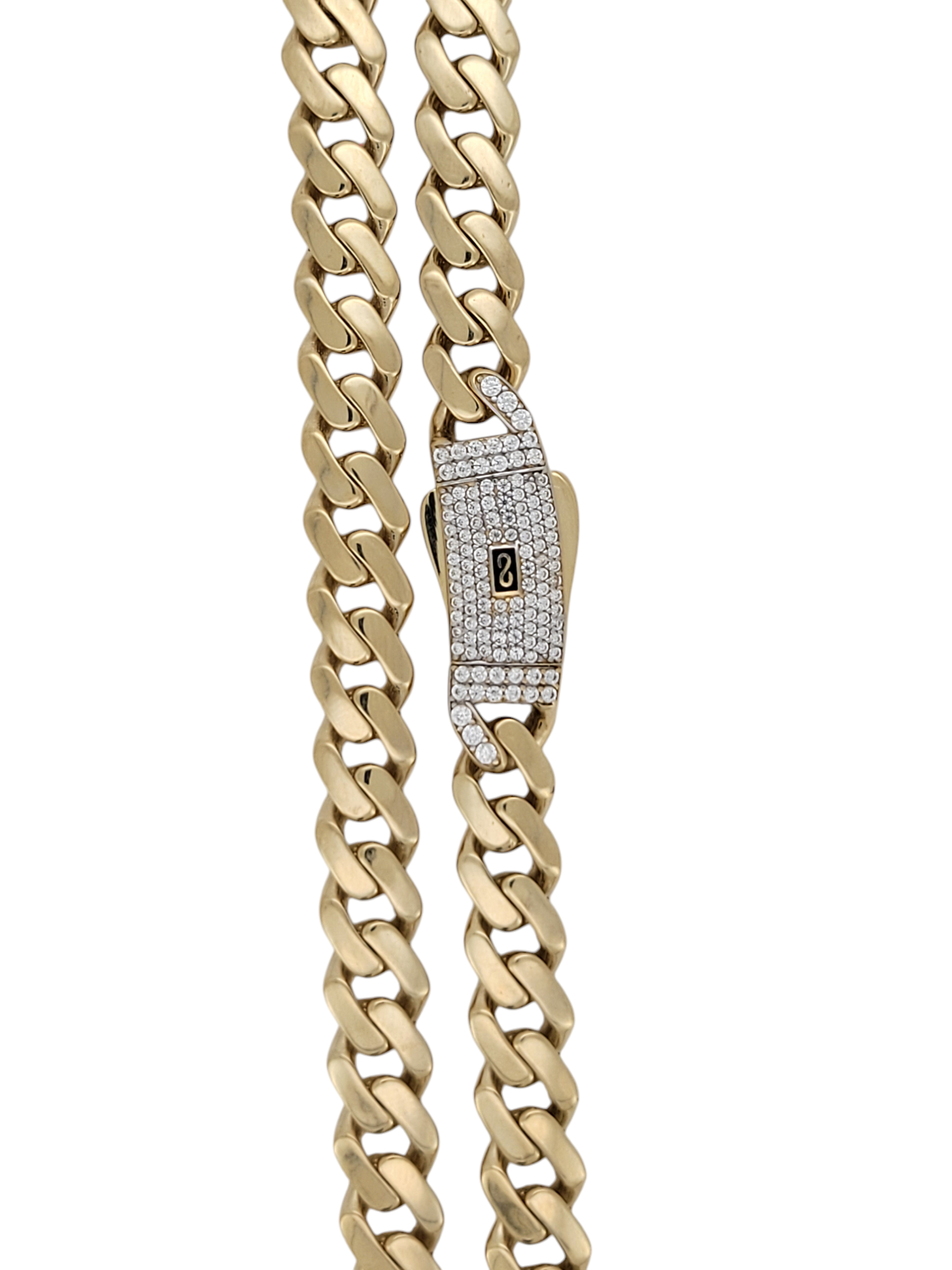 The Cuban chain 14 by Monaci features a CZ stone clasp and measures 20in with a width of 7mm. This classic and stylish piece adds a touch of sophistication to any outfit. Crafted with high-quality materials, it offers both durability and elegance. Perfect for any occasion, this chain is the ultimate accessory.